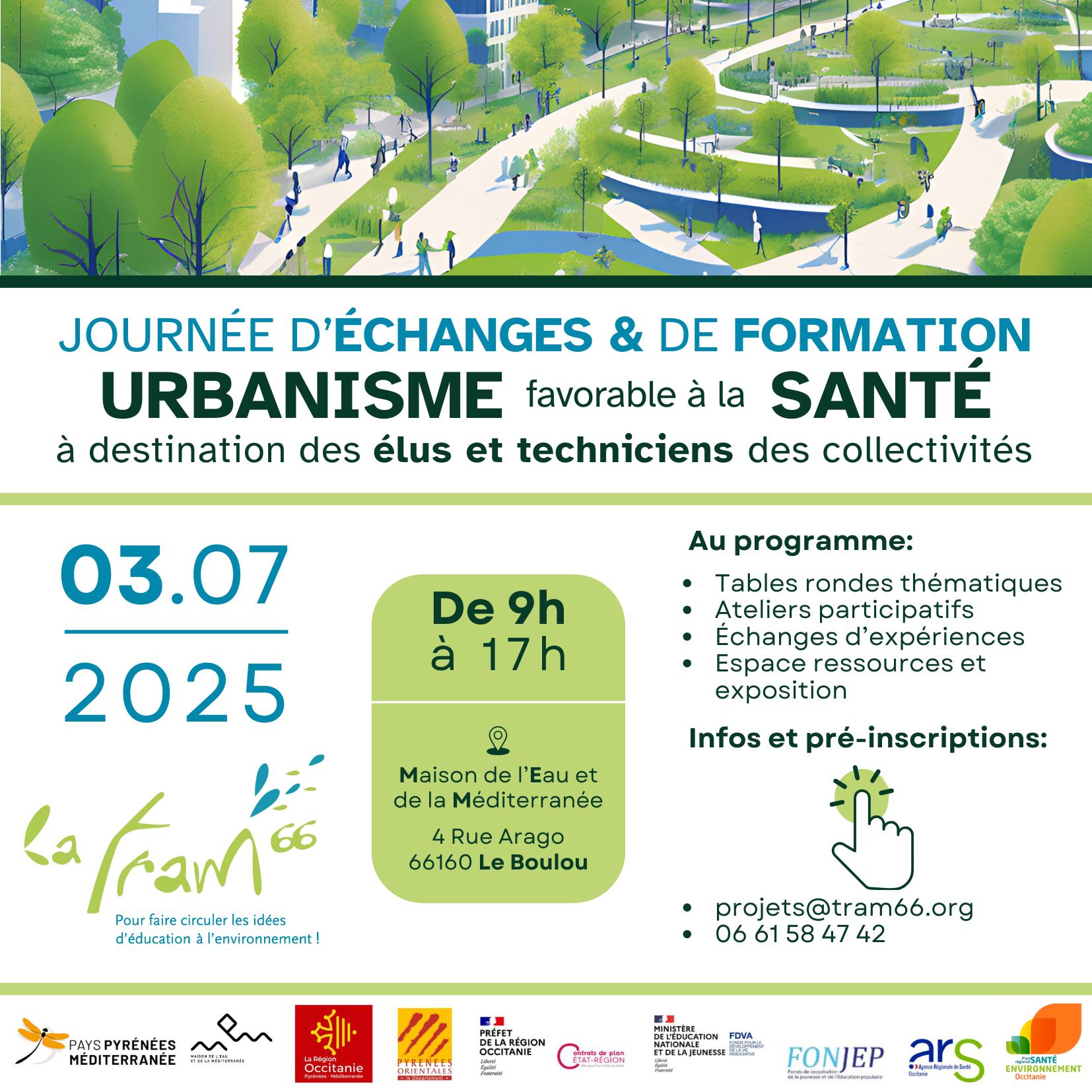 Imaginée à l’occasion de la réponse du réseau Tram’66 au PRSE 4 (Plan Régional Santé Environnement) de l’ARS Occitanie, cette journée d’échanges et de formation des élu.e.s et technicien.ne.s des collectivités territoriales a pour objectif de sensibiliser ces acteurs à la notion d’Urbanisme favorable à la Santé.