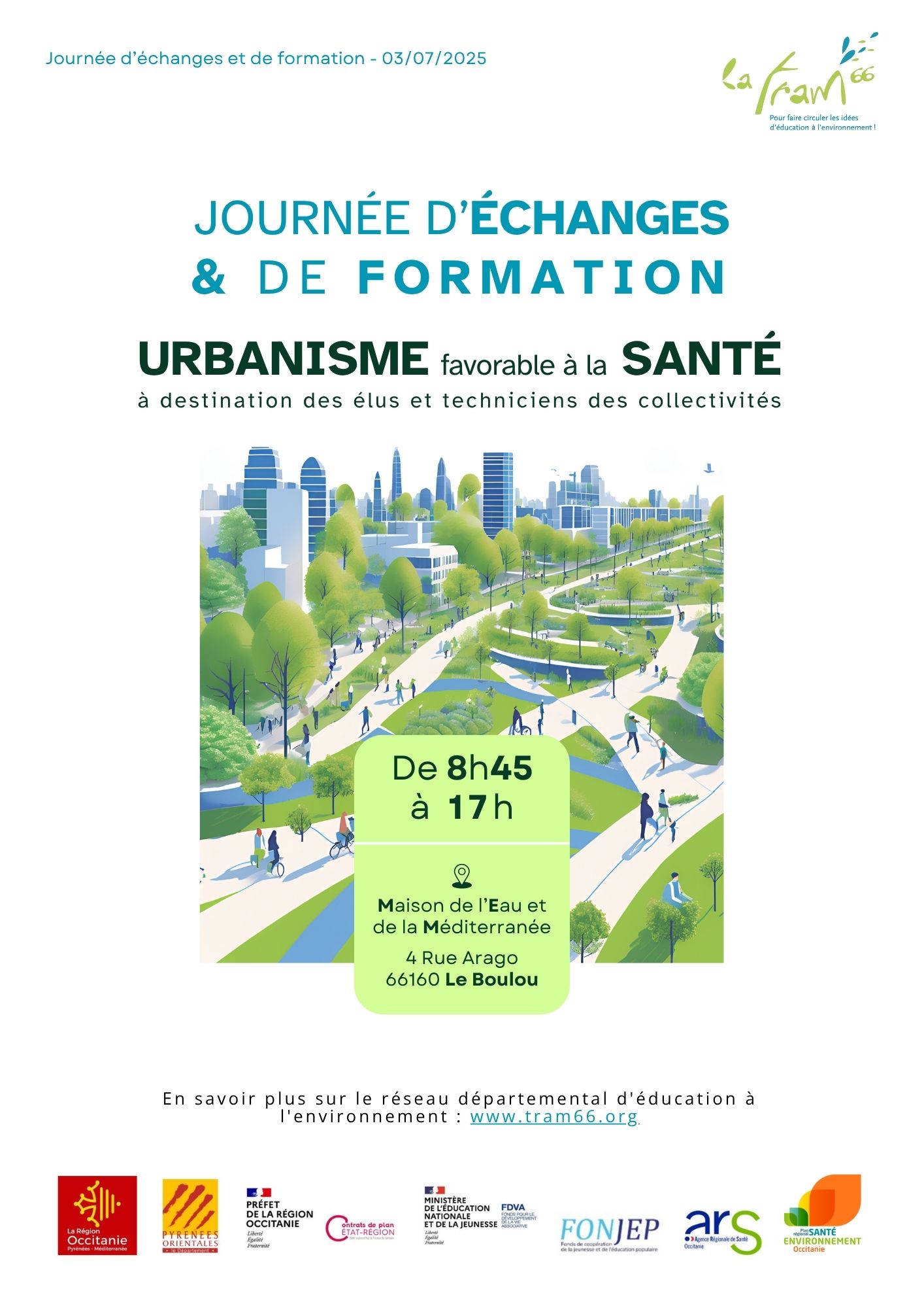 Le 3 juillet dernier s'est tenue une journée d'échanges et de formation autour de l'Urbanisme favorable à la Santé, organisée au Boulou par la Tram'66 dans le cadre des actions PRSE 4 de l'ARS, avec le soutien du Pays Pyrénées Méditerranée et de la Maison de l'Eau et de la Méditerranée.